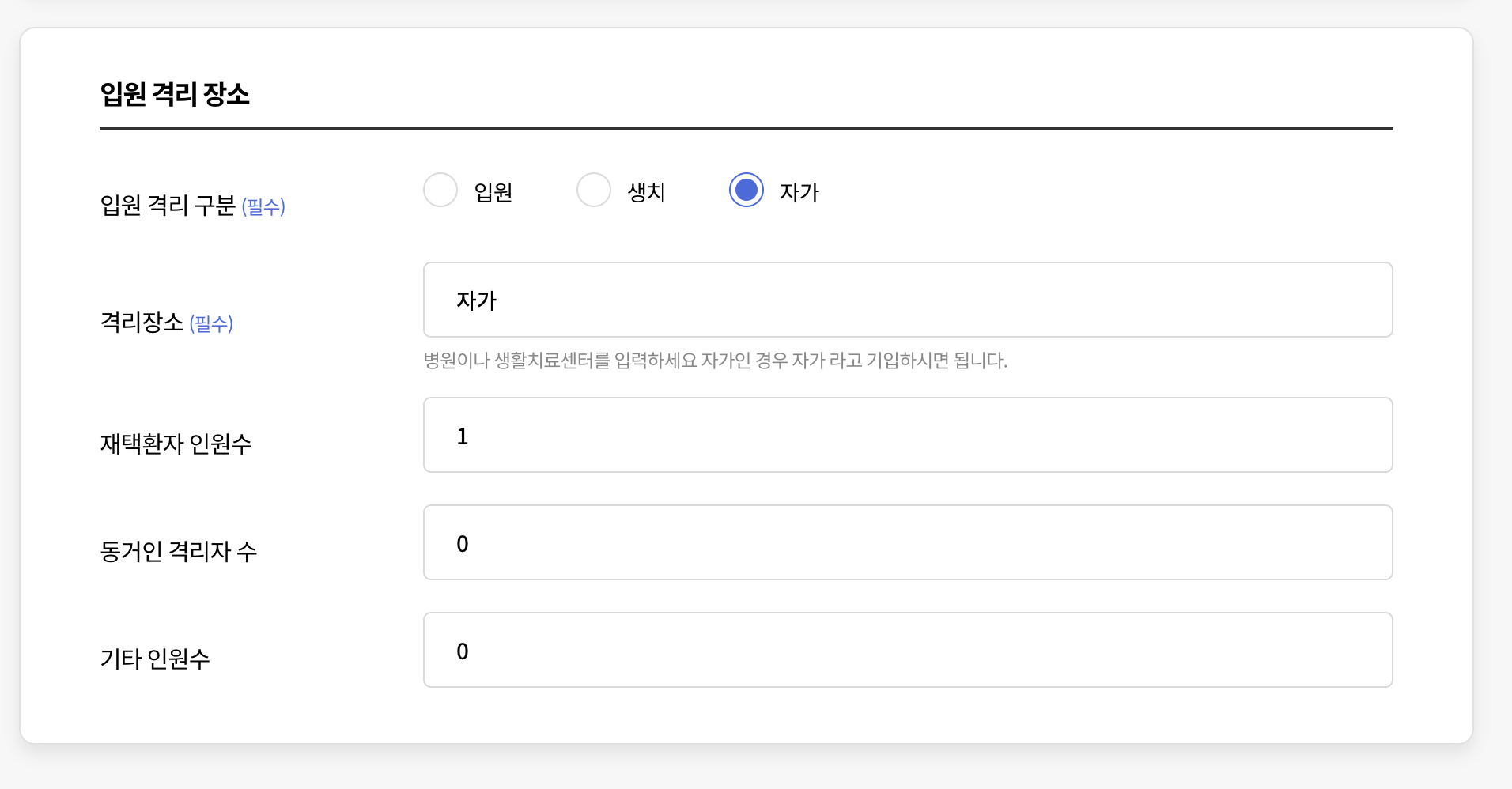 그 다음 격리한 장소와 격리 구분을 쓰면된다. 생치는 생활 치료 센터를 뜻한다.