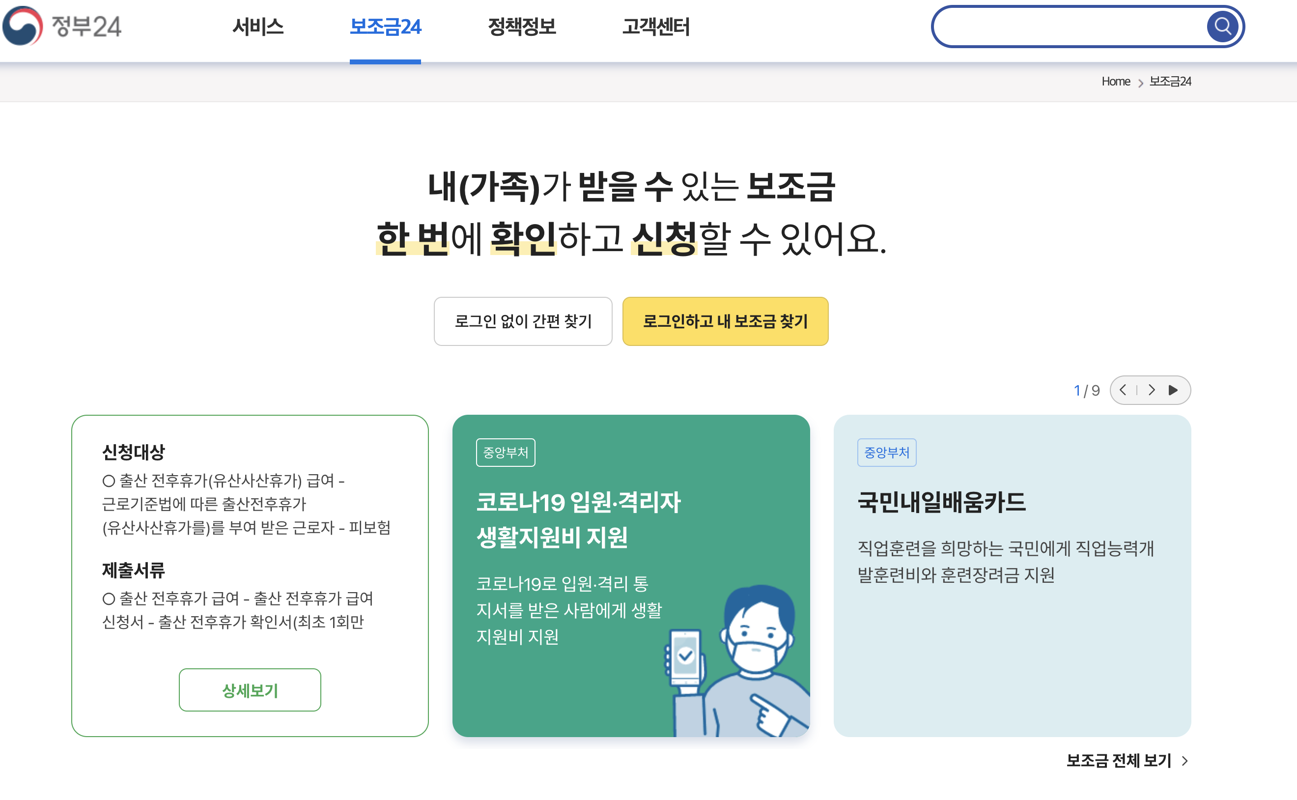 정부 24에 로그인 한 후 생활지원비 지원 상세보기를 클릭. 이어지는 페이지에서 바로 신청하기를 누르면 된다.