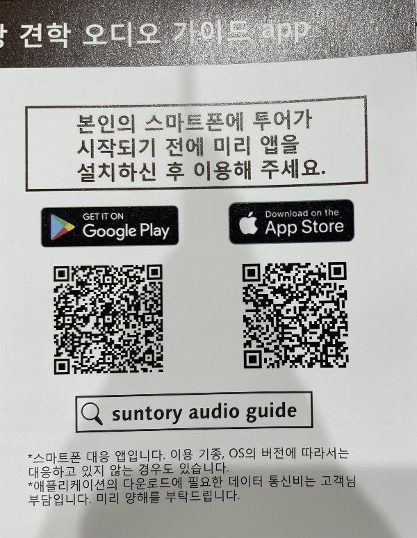 견학 건물로 들어가면 산토리 직원분들께서 안내를 해주시는데 가이드앱을 설치해야합니다.