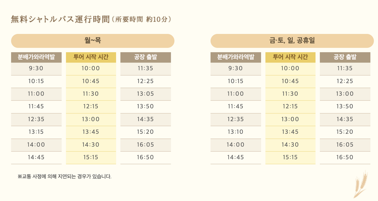 맥주 공장에서 운영하는 셔틀을 타기 위해서는 부바이가와라역에서 하차하여야 합니다