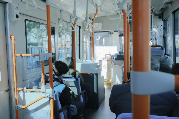 버스는 건물 입구 바로 앞에서 탑승할 수 있습니다.