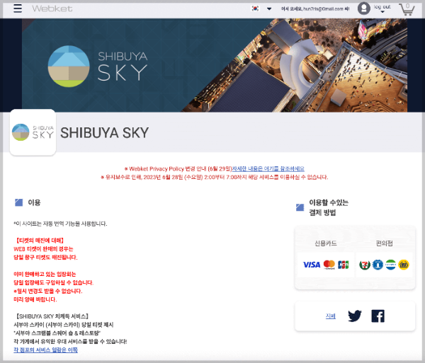 톱 페이지에서 결제에 사용 가능한 카드 정보를 확인해주시고 하단으로 내려가서 시부야 스카이 입장 티켓 구매를 클릭해주세요.