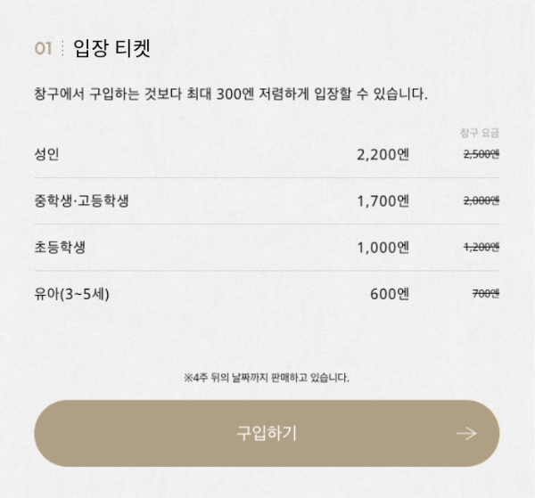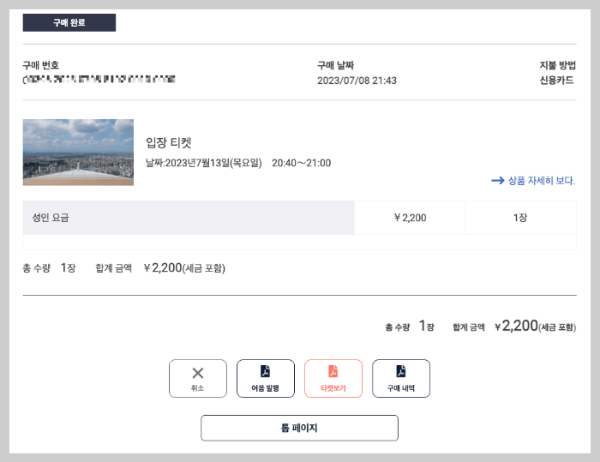 방문하는 날짜와 시간, 수량을 선택하시고 하단에 구매 수속을 누르시면 결제 페이지로 이동됩니다.