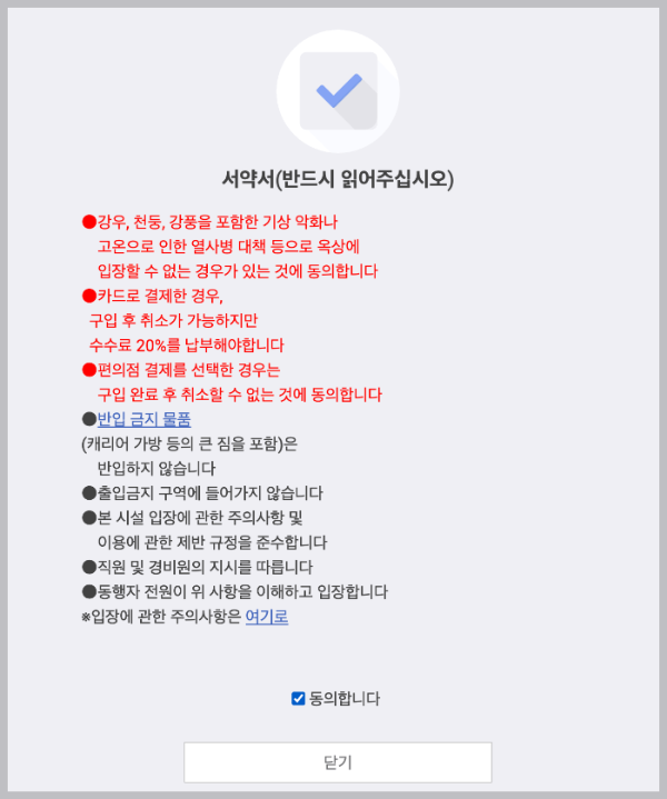 기다려주시면 티켓 구매 전 서약 사항이 뜨게 됩니다.