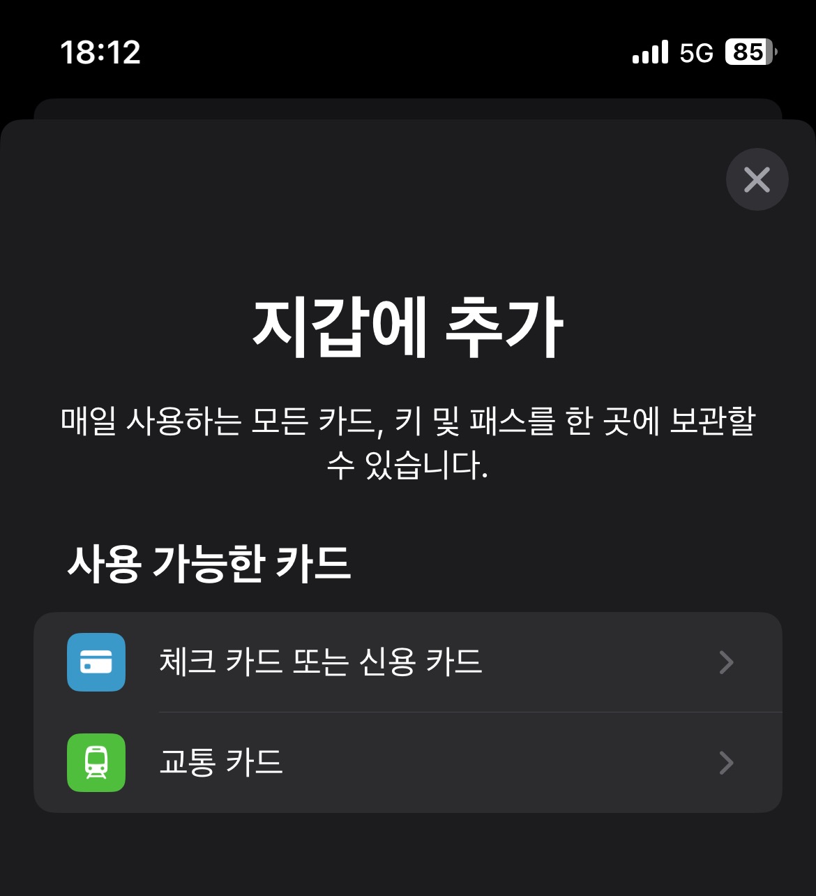 그 다음 우측 상단에 + 모양을 눌르고 교통 카드 추가를 선택한다.