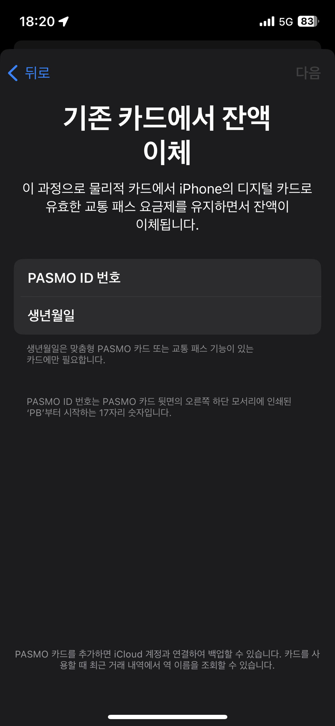 실물 카드가 없는 경우엔 먼저 파스모 앱을 다운 받아 카드를 발급받은 후 이전하시면 됩니다.
