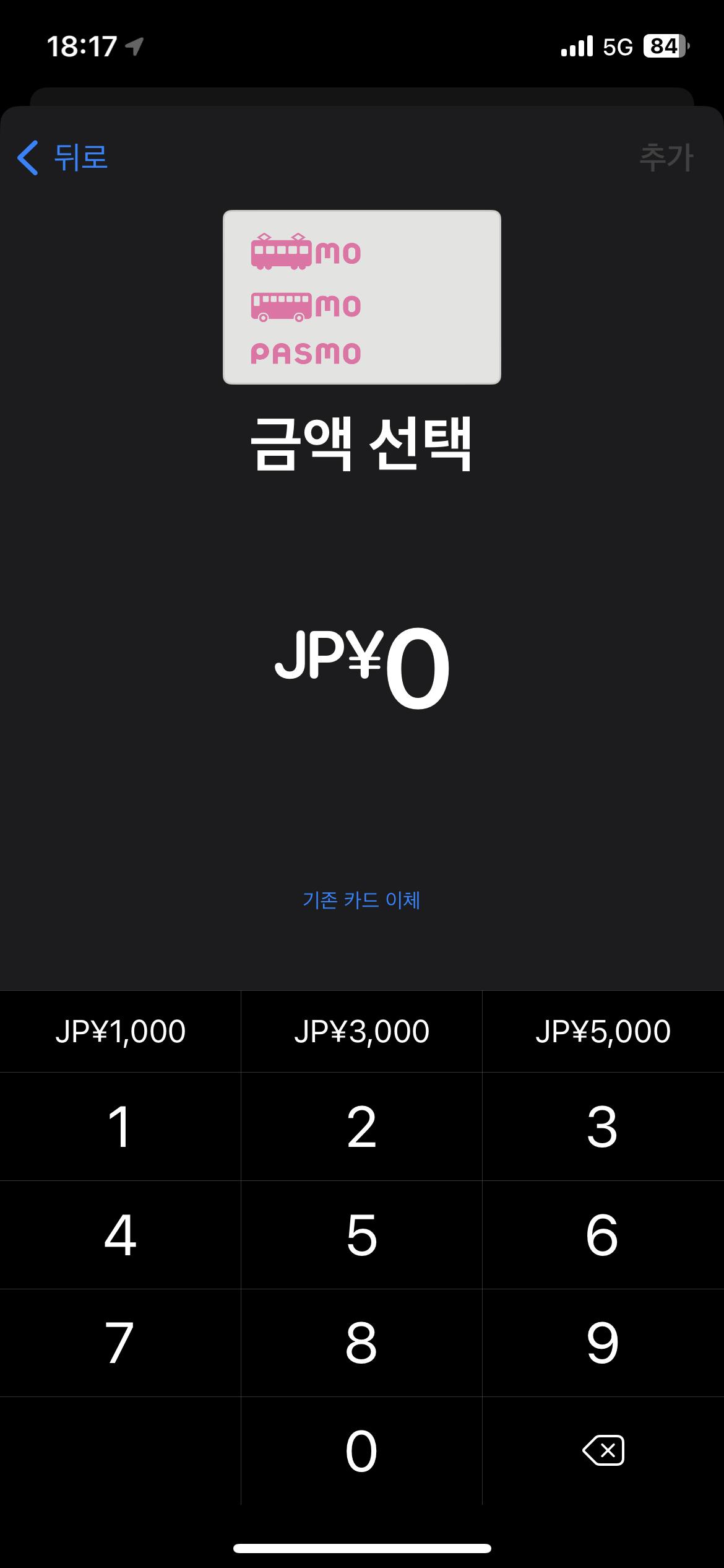 파스모나 스이카를 선택한 후 계속을 누르면 금액 충전 화면으로 넘어갑니다.