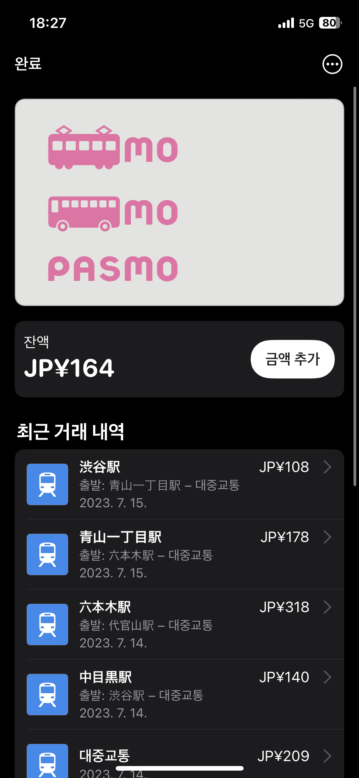 여행 초반에는 파스모 실물 카드를 들고다니며 쓰곤 했는데 날이 더워서인지 카드지갑에서 꺼내쓰고 다시 주머니에 넣는게 점점 귀찮아졌다.