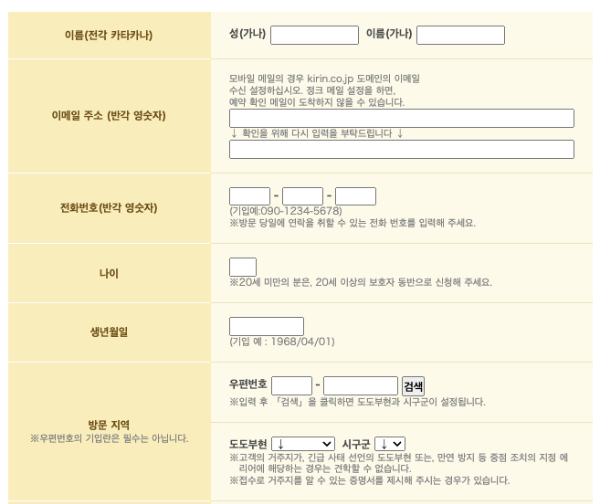 이름은 카타카나로 변화하여 작성해야하며, 전화번호는 010 대신에 8210로 입력하시면됩니다.