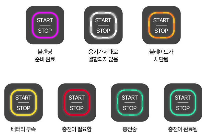 닌자 블라스트는 전원을 켠 후 내용물을 넣고 버튼을 누르면 알아서 30초간 내용물을 갈아주는데, 이때 문제가 생긴다면 LED의 색상을 통해 정확한 상태를 확인할 수 있습니다.