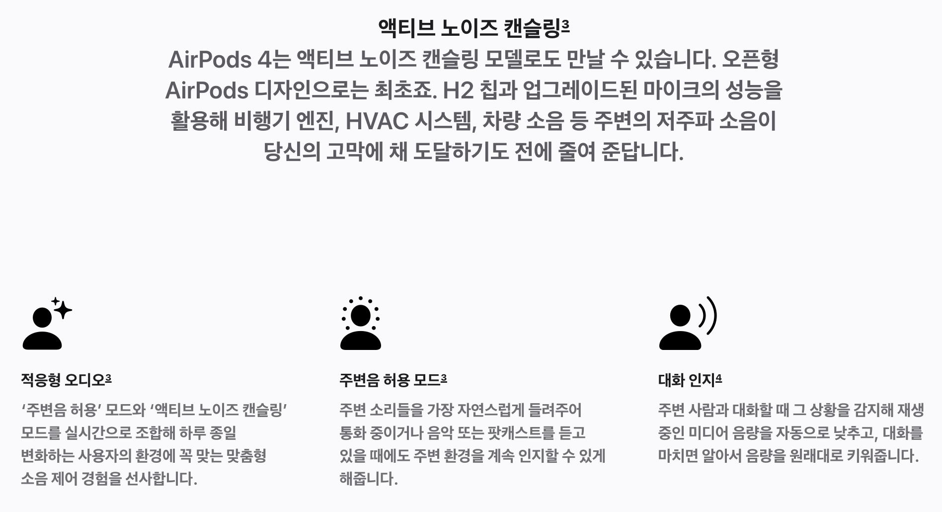 하지만 이번 에어팟 4세대는 애플 최초로 오픈형에 액티브 노이즈 캔슬링을 채택하였습니다.