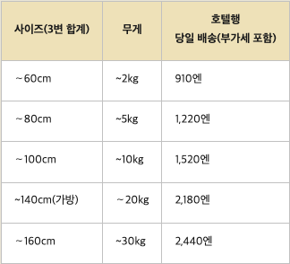 - 요금: S 800엔(3변의 길이 합 100cm 이하), M 1,000엔(100 - 160cm), L 1,500엔(161cm 이상)
