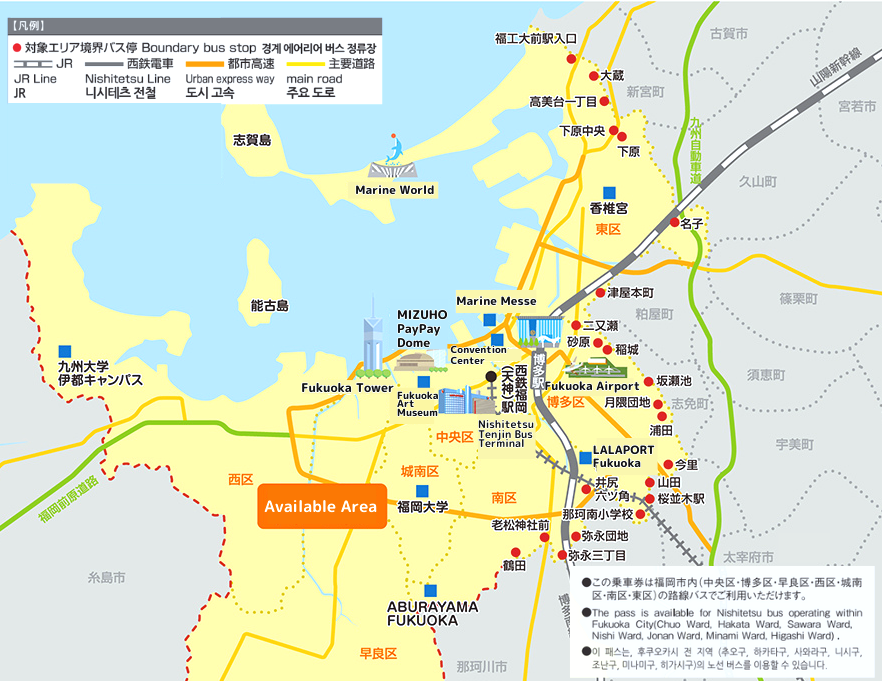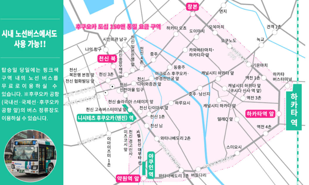 - 이용 가능 노선: 후쿠오카 전지역(추오구, 하카타구, 시와라구, 니시구, 조난구, 미나미구, 히가시구)의 노선 버스를 이용할 수 있습니다.