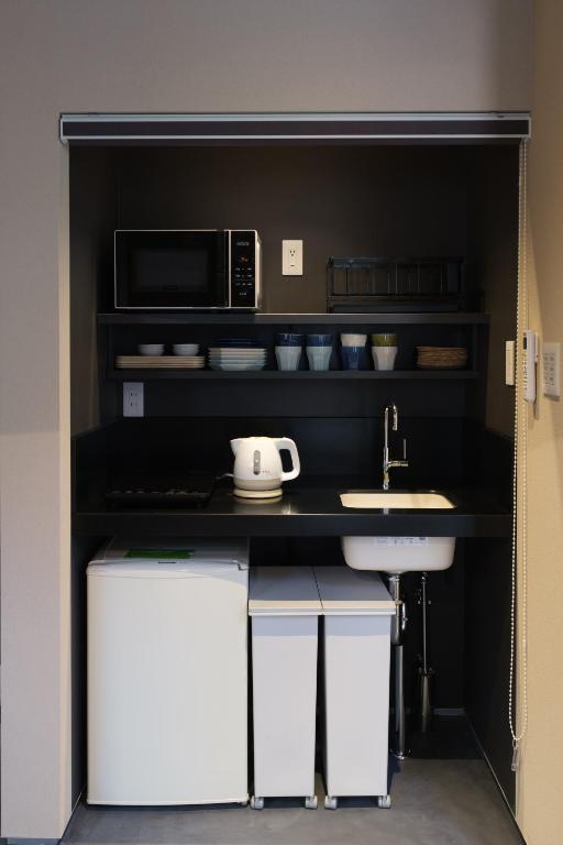 주방에는 전자레인지, 냉장고, 전기포트 등이 준비되어 있어 간단한 식사나 음료 준비도 가능한데요. 큰 도심에 비해 주변 상권이 일찍 끝나는 소도시 특성 상 저녁 이후 숙소에서 가볍게 한잔을 즐기기 좋습니다.
