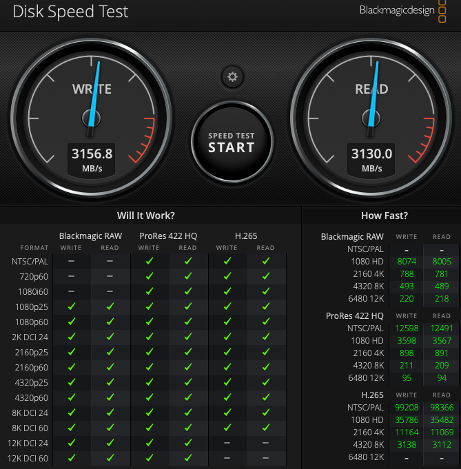 Disk Speed Test is an easy to use tool to quickly measure and certify your disk performance for working with high quality video! Simply click the start button and Disk Speed Test will write test your disk using large blocks of data, and then display the