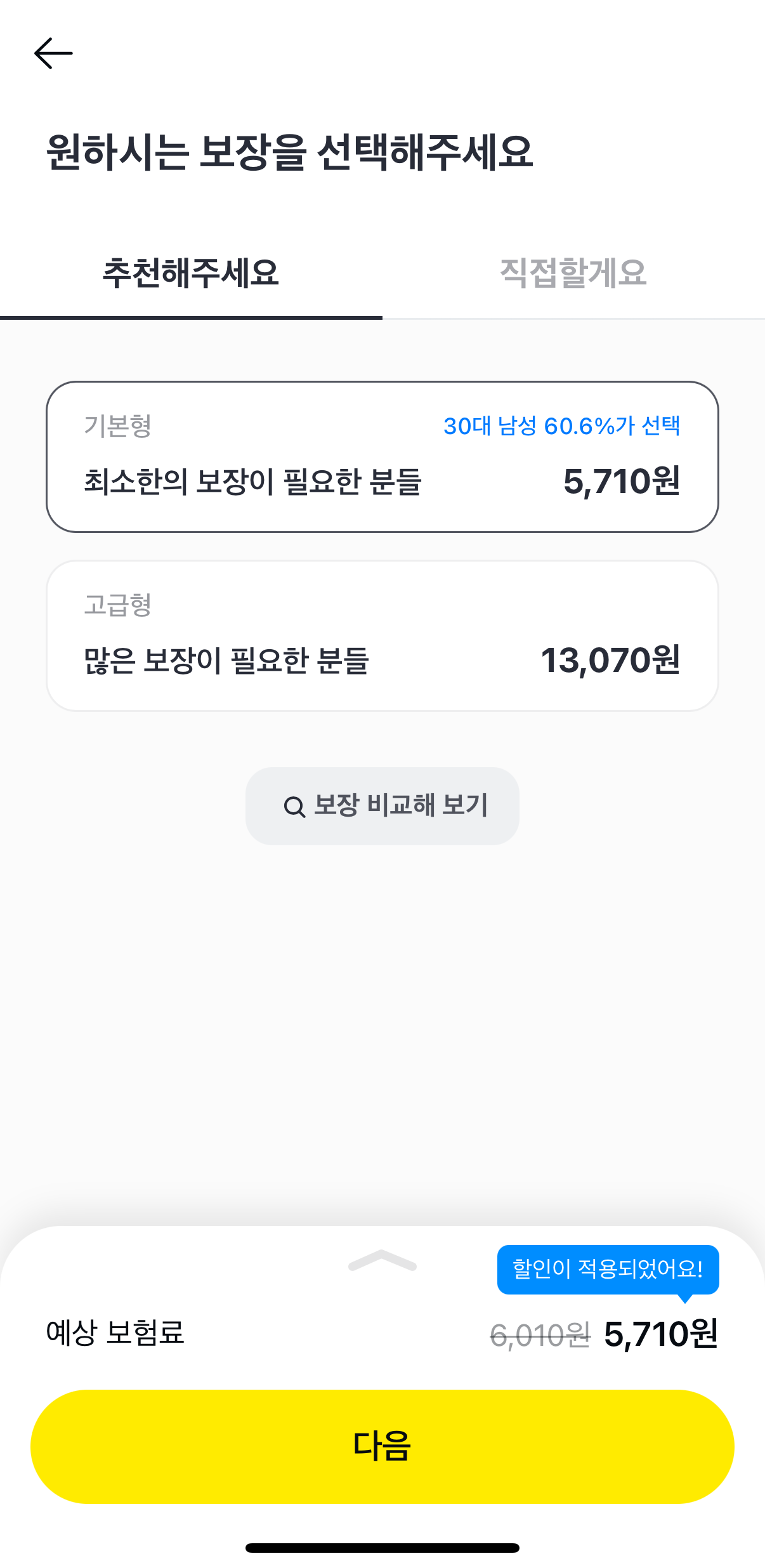 이후 일정, 여행 국가, 보험 보장 등을 선택하면 빠르게 가입이 가능합니다.