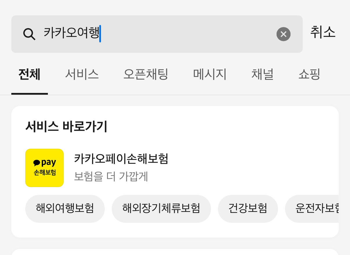 - 카카오톡 상단 돋보기 선택 → '카카오페이 손해보험' 검색