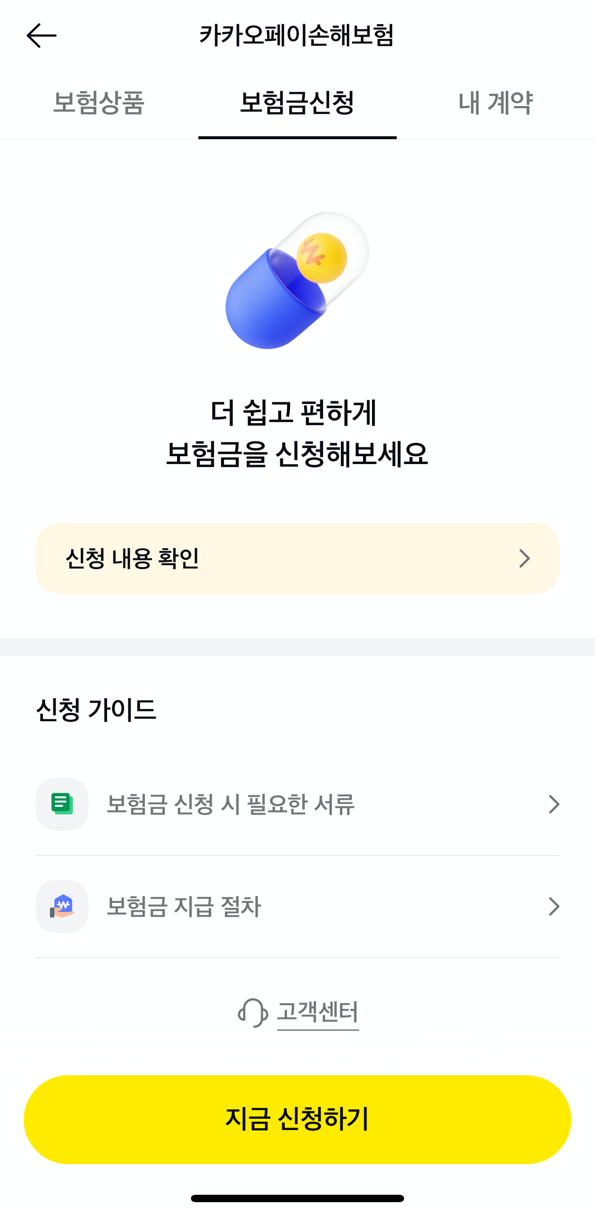 보험금 청구 역시 카카오톡을 통해서 손쉽게 제출이 가능합니다. 보험금을 신청해야할 상황이 생긴다면 카카오톡에서 카카오페이손해보험 검색한 후 서비스로 이동하여 '지금 신청하기'를 선택하고 절차에 따라 차례대로 신청하면됩니다.