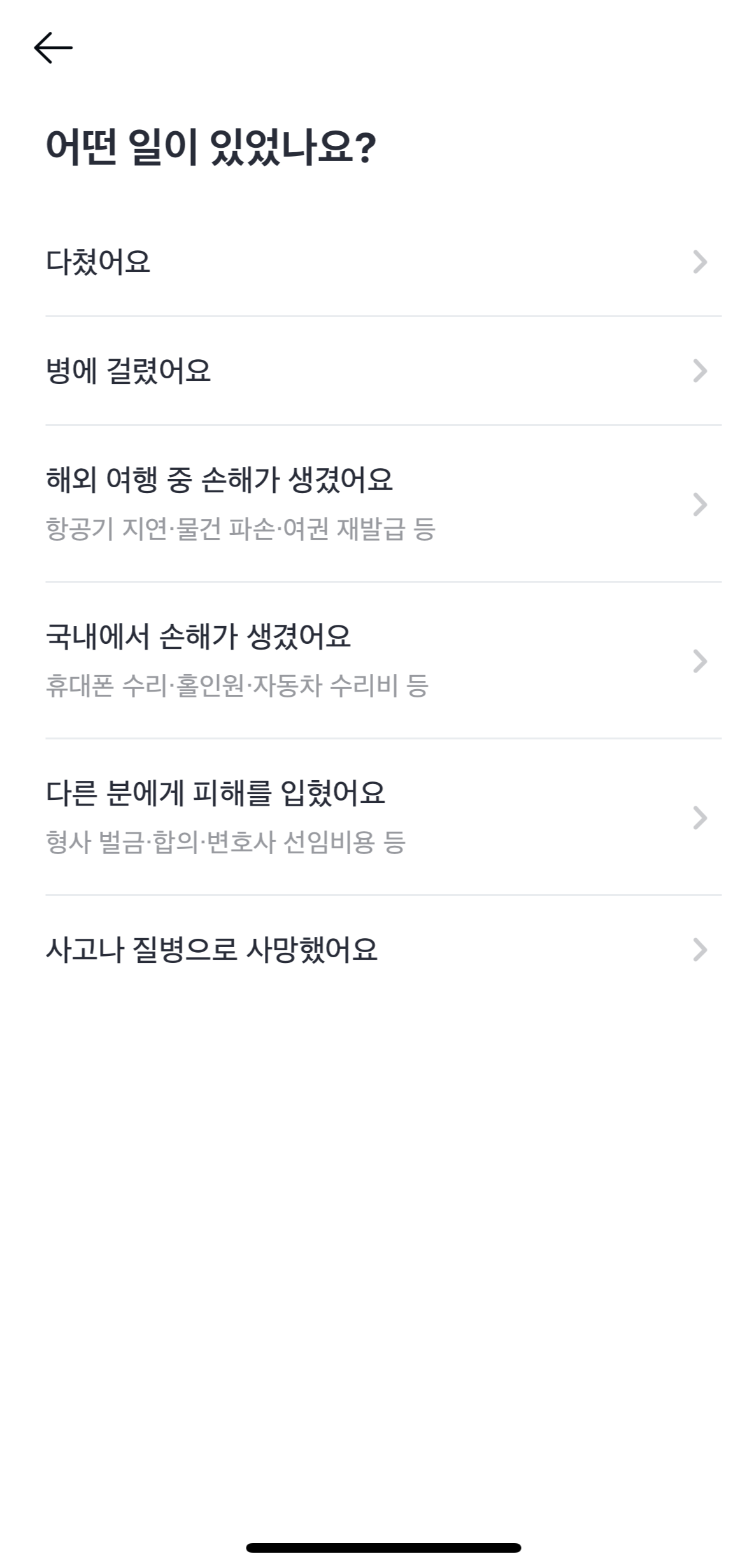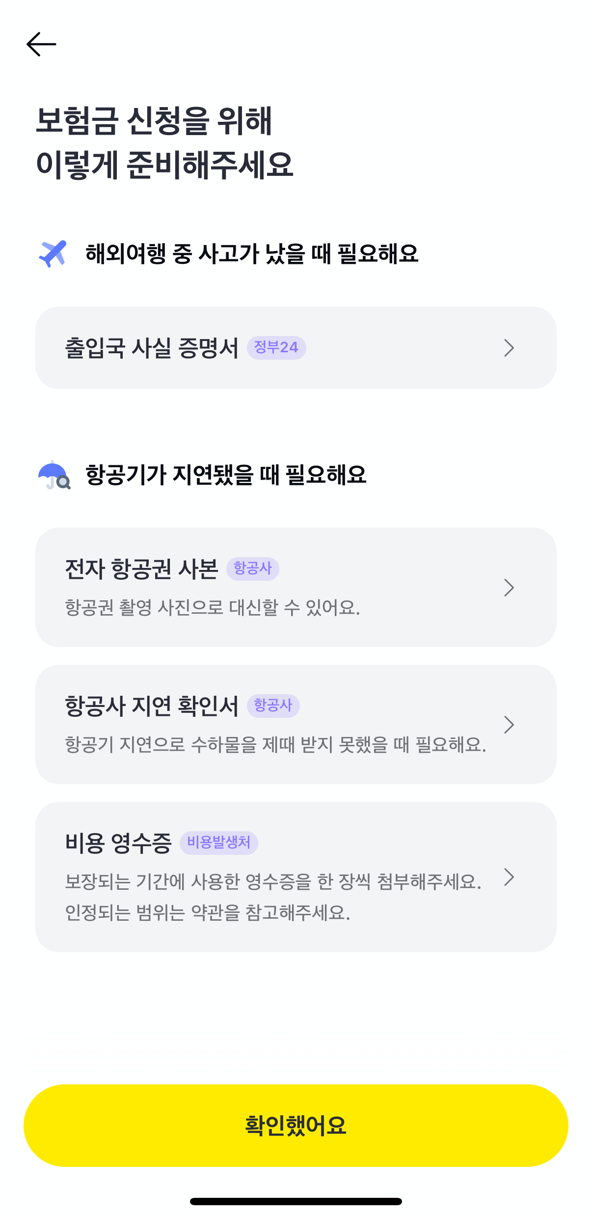 만약 여행 중 사고가 발생해 보험금을 청구해야 할 때 상황에 따라 준비해야하는 서류 종류가 다양합니다. 각 상황에 필요한 서류 역시 스마트폰을 통해 카카오페이손해보험에 접속하여 확인이 가능합니다.