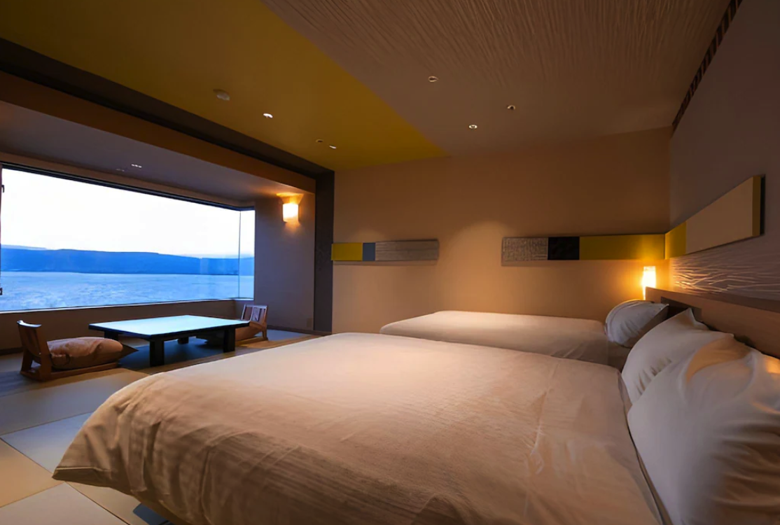 이런 잔잔하고 아름다운 스와 호 전경을 만끽하며 쉴 수 있는 호텔 베니야를 추천드리고자 합니다. 호수 바로 앞에 위치해 있으며, 일본식 정취와 현대적 편안함이 조화를 이룬 호텔입니다.