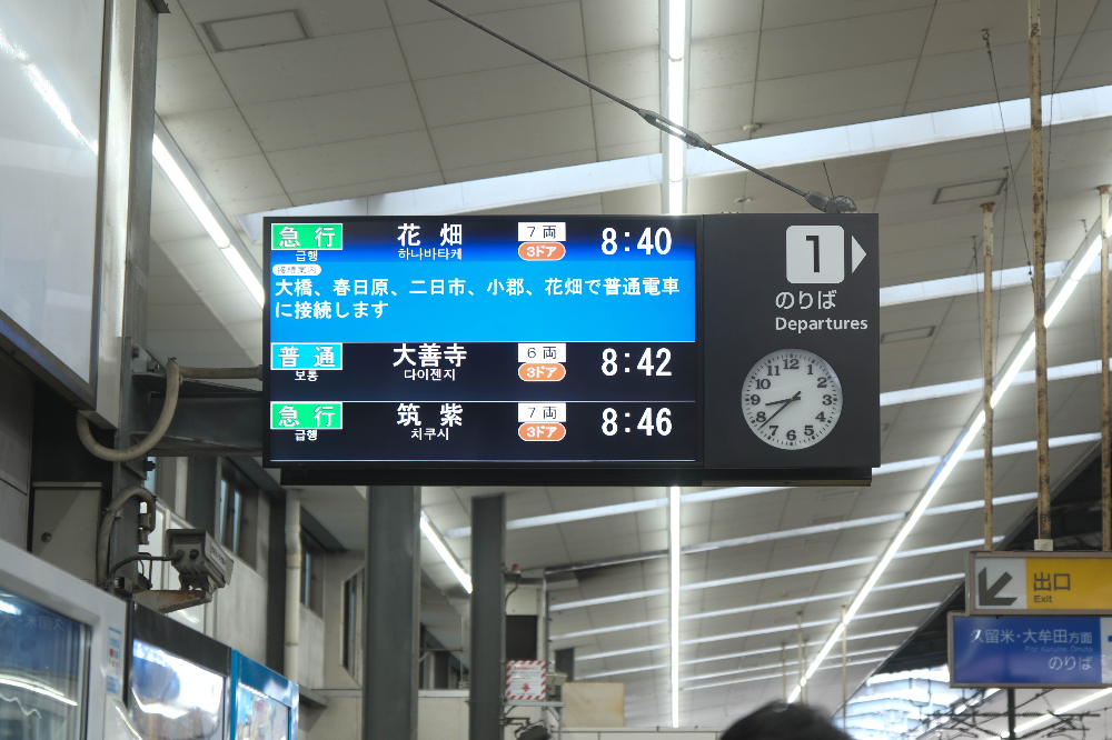 야쿠인에서 정시에 급행을 타고 출발을 했습니다만, 니시테쓰오고리역 까지의 도착시간이 점점 늦어지다가 결국 예상 시간보다 5분이나 늦은 13분에 도착하게 되었습니다.