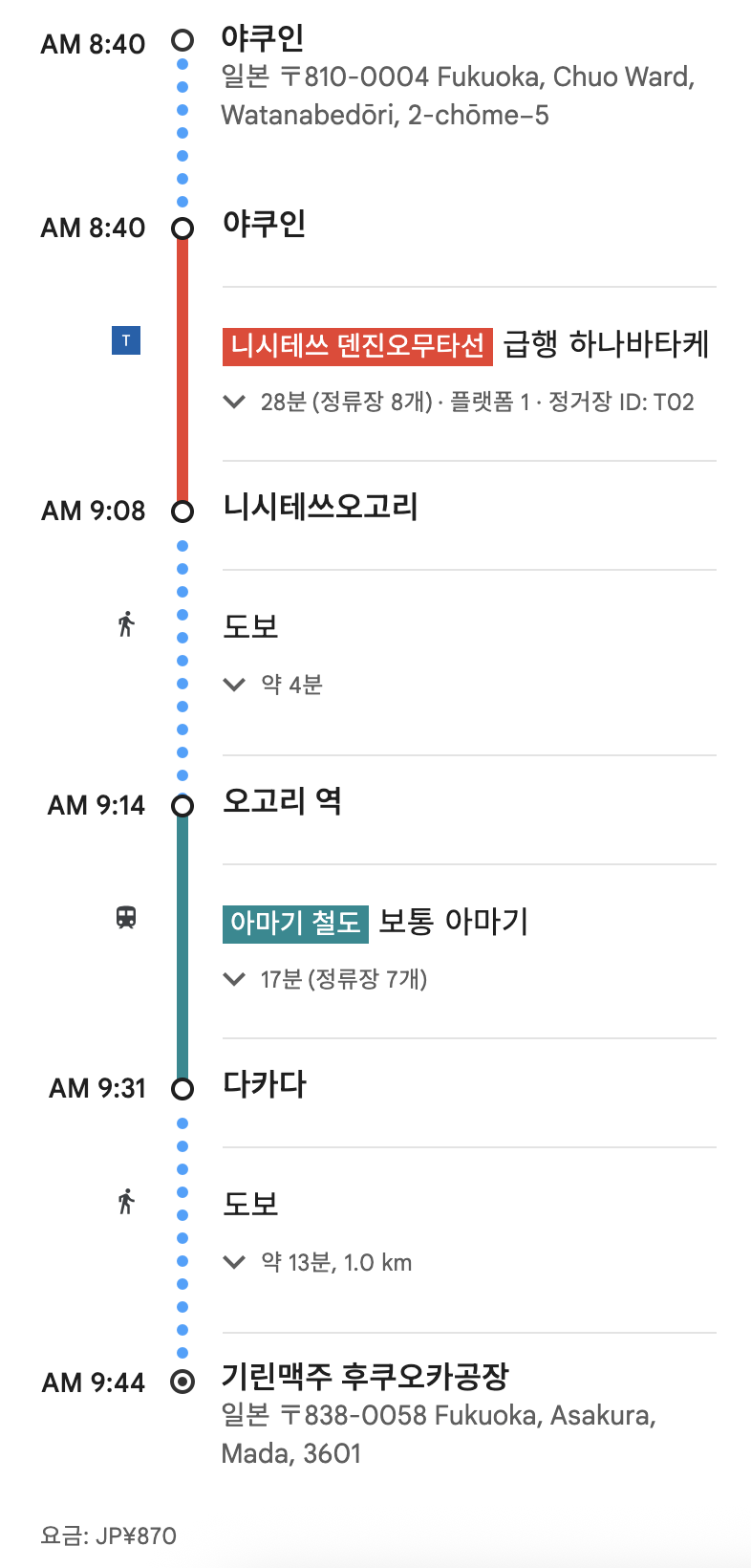 저희는 후쿠오카 기린 맥주 공장까지 지하철을 이용했습니다. 야쿠인 역에서 니시테쓰 텐진오무타 급행을 이용하여 니시테쓰오고리역 이동할 계획이었습니다.