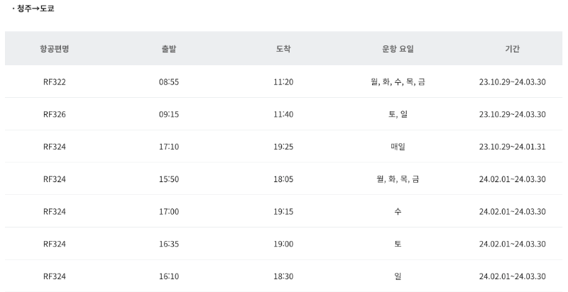 도쿄 나리타행의 경우 편성이 늘어나 더 다양한 시간대가 생겼습니다.